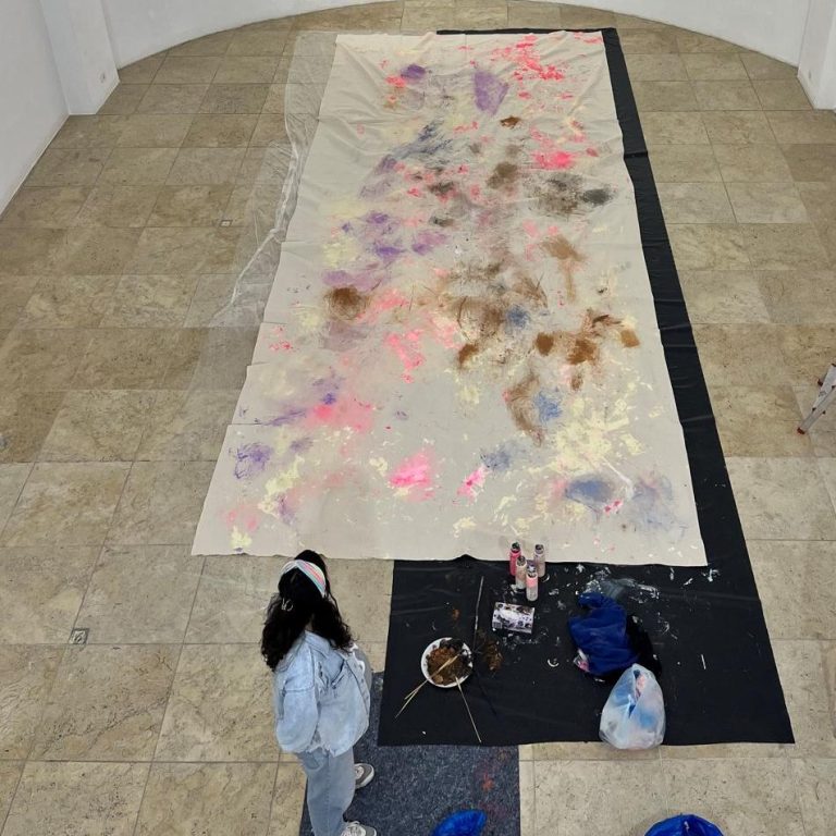 Entstanden ist eine 3 × 8 Meter große Leinwand, geprägt durch körperliche Bewegung, direkten Kontakt sowie den Einsatz von Farbe und Erde. Die Arbeit versteht sich nicht als durchkomponiertes, abgeschlossenes Bild, sondern als konzeptuelle Setzung, in der sich ein körperlich erfahrener Transformationsprozess materialisiert.